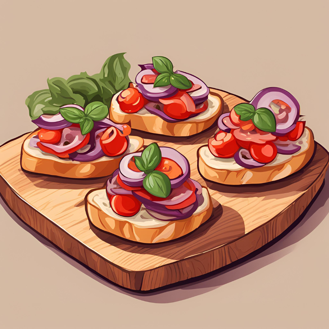 geröstete Brotscheiben mit Tomaten, Zwiebeln, Basilikum, Knoblauch und Olivenöl